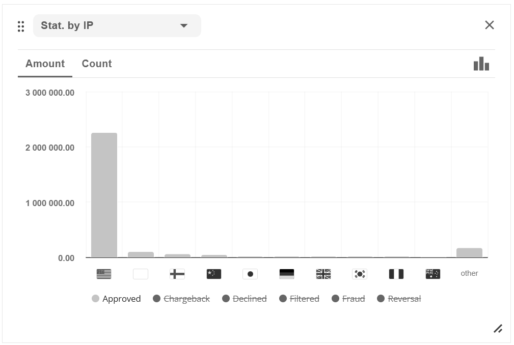 button: the ratio by volume of transactions or by amount of payments, as well as by type of transactions (sale, capture, transfer, etc). ChamPay Payment Gateway also displays statistics on negative activity and earnings.