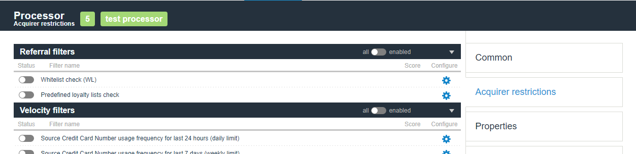 This functionality allows to prevent non-successful processing of transactions on all gates of the same processor which have specific limitations. To switch them on, go to the required processor and click on the “Acquirer restrictions” tab. Tab will be available only for manager account and linked superiors.