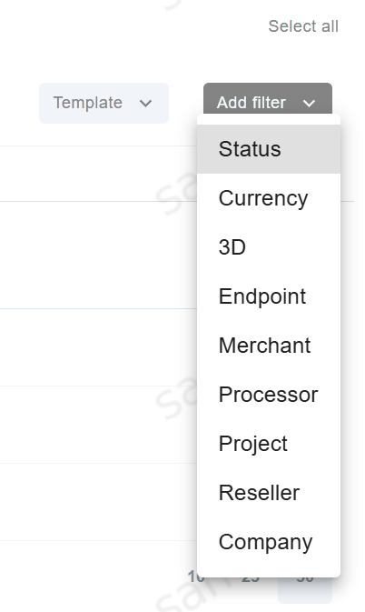 To add new search filters, click the Add filter button. It possible to filter by: Status, Currency, 3D, Endpoint, Merchant, Processor, Project, Reseller and Company.