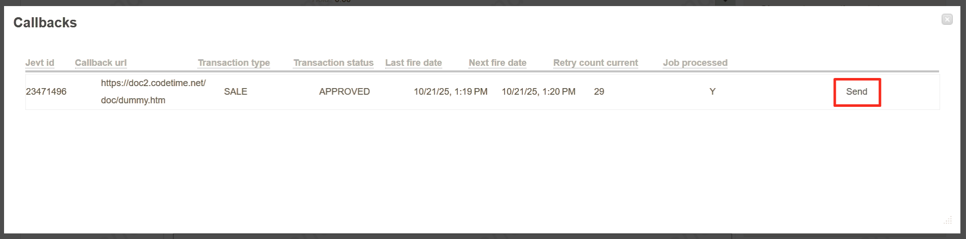 If the order has final status and had server_callback_url in the initial request, the Merchant can re-send the final callback. To send a callback to the Connecting Party, go to the details of the relevant order. On the order details page, click the Callbacks button.