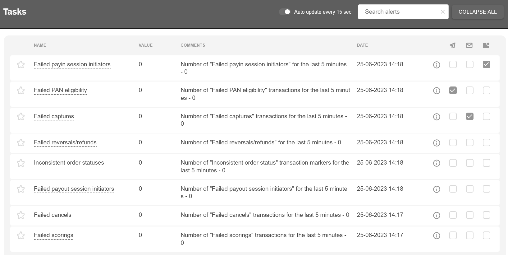 The screen is located in “Tools” – “Monitoring” section. This screen displays information about various errors that usually require quick response, as well as the options to subscribe for notifications about any errors via Telegram, Email or Push notification. Phone number and e-mail address are taken from the personal account (Merchant or its employee account).